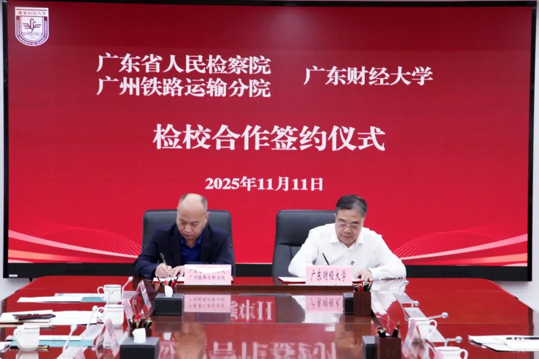 2025年11月11日,广东省人民检察院广州铁路运输分院与广东财经大学检校合作签约仪式在广东财经大学举行。广东省人民检察院广州铁路运输分院分党组书记、检察长杨宇与广东财经大学党委书记郑贤操在签约仪式上分别致辞讲话,并签署了合作框架协议。广东财经大学常务副校长鲁晓明主持签约仪式。