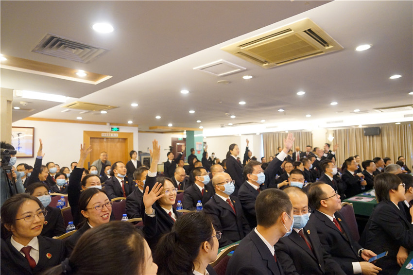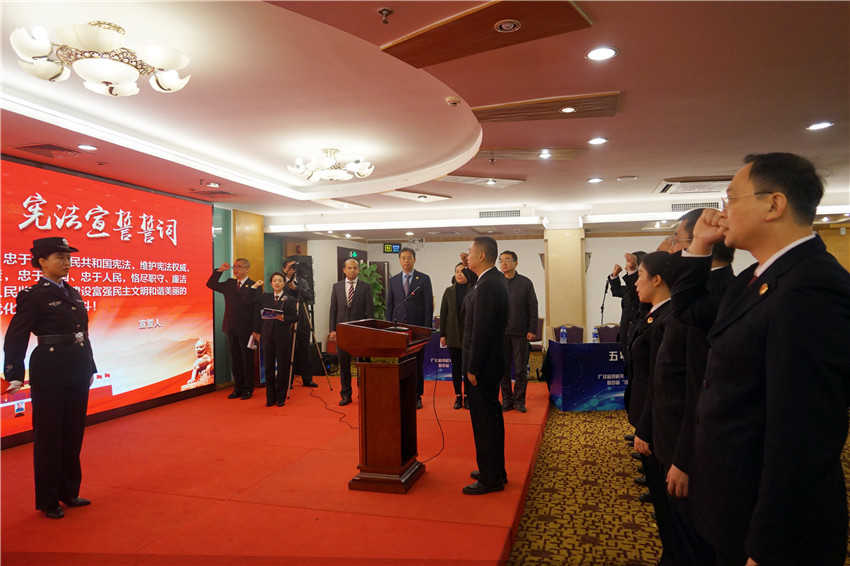 赛前,由分党组书记、检察长李小东领誓,广铁检察机关全体干警面对国旗进行庄严的宪法宣誓。省人大常委会委员刘涛,人民监督员钟晓文、赵天一、张经中现场监誓。李小东检察长强调,宪法赋予检察机关法律监督的职责使命,我们要立足铁检岗位和具体工作,用实际行动切实保证宪法的正确实施,努力担当起社会主义法治国家建设者、捍卫者的历史使命。今年11月,党的历史上首次召开的中央全面依法治国工作会议,将习近平法治思想明确为全面依法治国的指导思想,我们要认真学习领会会议精神、把握核心要义,切实把习近平法治思想贯彻落实到全面依法治国全过程,主动担当检察职责使命,坚定理想信念,练就过硬本领。