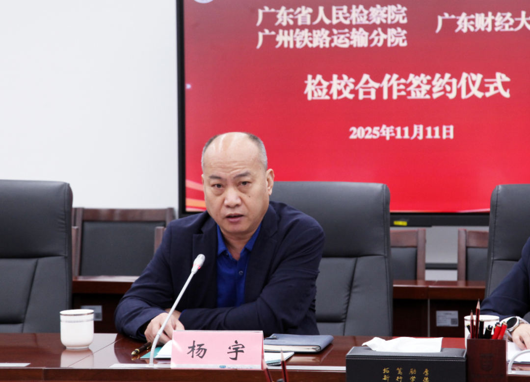 2025年11月11日,广东省人民检察院广州铁路运输分院与广东财经大学检校合作签约仪式在广东财经大学举行。广东省人民检察院广州铁路运输分院分党组书记、检察长杨宇与广东财经大学党委书记郑贤操在签约仪式上分别致辞讲话,并签署了合作框架协议。广东财经大学常务副校长鲁晓明主持签约仪式。