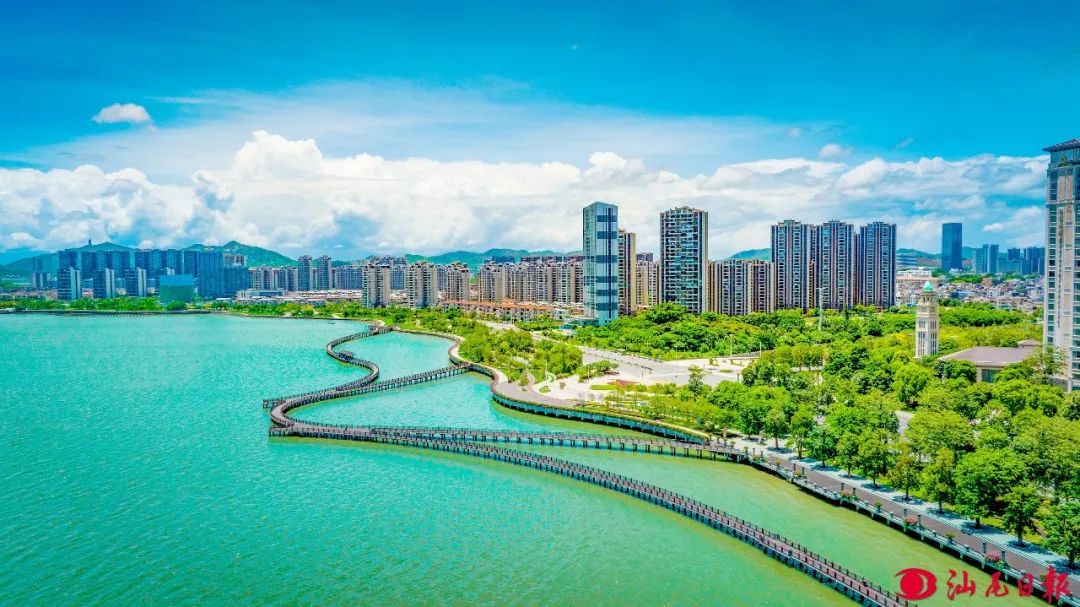 蓝天白云下,品清湖畔绿意环绕,“山海湖城”相互辉映,一幅人与自然和谐共生的生态画卷徐徐铺展。