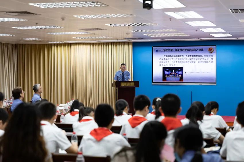 2023年6月1日,冯键作为广东实验中学法治副校长,为受邀参加“检爱同行,共护花开”检察开放日活动的师生代表以及代表委员、教育部门有关同志等介绍未检工作情况。
