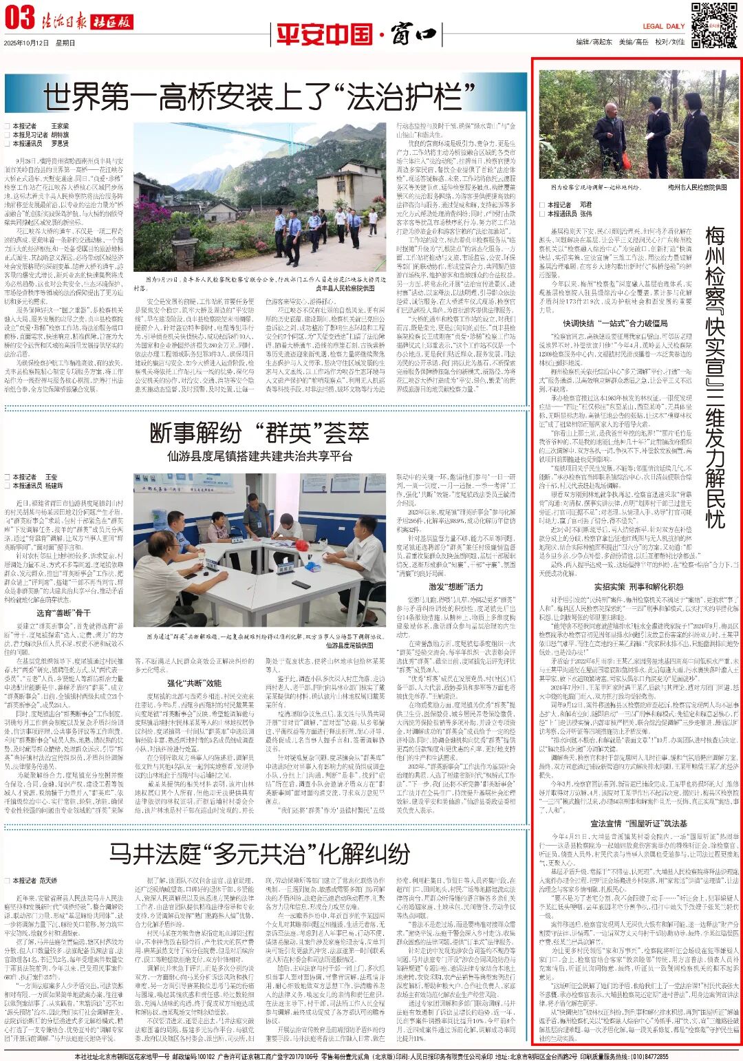 基层稳则天下安,民心顺则治理兴。如何将矛盾化解在源头、问题解决在基层,让公平正义浸润民心?梅州市检察机关以“检察融入综治中心”为突破口,创新打造“快调快结、实招实策、宣法宣情”三维工作法,用法治力量破解基层治理难题,在客乡大地勾勒出新时代“枫桥经验”的鲜活图景。