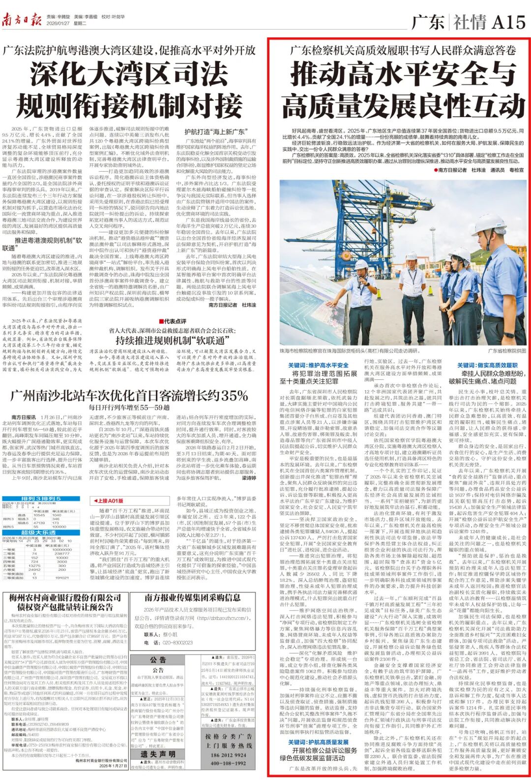 一个个扎实的工作印记,见证了2025年以来全省检察机关忠诚履职,完整准确全面贯彻新发展理念,着力以高质量司法服务保障广东经济社会高质量发展的忠诚担当。一系列“实招硬招”,为新的更好地发展筑牢法治基石、积蓄动能。